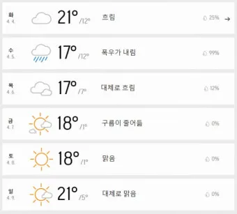 서쪽은 흐림, 동쪽은 맑음처럼 뚜렷하게 갈릴 수 있으니, 지역별 주간날씨로 반드시 세분화하세요.